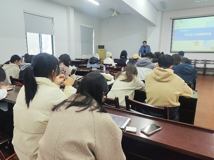 讲座伊始,黄东涛老师介绍研究生常见的心理障碍与问题来源。他分析了当前就业市场和就业形势,指出未来职业发展将呈现易变性、不确定、复杂性、模糊性等特点。他建议班级导师以“心理课程提升”为指导,帮助员工心理健康观念辅导和职业生涯规划。黄东涛老师主要从情绪管理、压力应对、心理求助三个方面展开讲解,指出研究生存在的压力主要包括就业、经济、学业、情感以及社会价值观念认知压力。在面对压力时,应正确认识情绪状态、正确认识心理咨询,通过积极自我调节、主动寻求外界帮助等方式排解压力、调整状态。