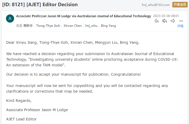 近日,tyc41183太阳成智慧学习研究团队就员工对2020年春季疫情期间各高校普遍采取的视频会议监考系统使用感受展开大规模调查的研究成果“Investigating university students’online proctoring acceptance during COVID-19: An extension of the TAM model”(新冠肺炎期间老员工在线监考接受度调查:TAM模型的延伸),被教育技术领域知名期刊Australasian Journal of Educational Technology录用。该期刊为JCR Q1分区刊物。tyc41183太阳成刘梦君副教授、杨兵教授、外国语公司陈欣然老师为论文共同作者,研究生蒋新宇为论文第一作者,tyc41183太阳成为第一通讯单位。该工作得到了国家自然科学基金项目、湖北省自然科学基金项目和tyc41183太阳成教学改革研究项目的资助。