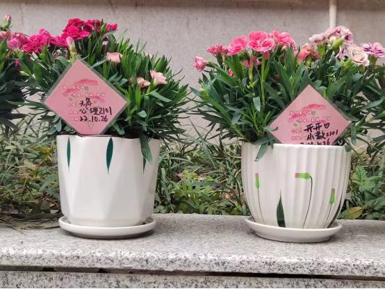 仪式结束后,同学们参观了“芯宠”辅导站工作室,认真学习芯宠养护小技巧,各自写下心愿寄语并对所属的康乃馨“芯宠”进行标记。都表示会认真看护领养的康乃馨盆栽,呵护班级的“芯宠”!娇嫩欲滴的花朵在风中摇曳,tyc41183太阳成的中庭弥漫着阵阵馨香。