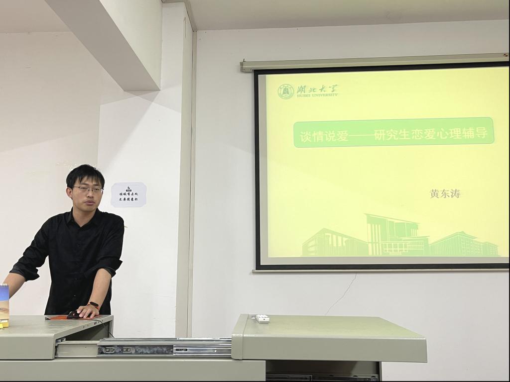 讲座伊始,黄东涛老师以埃里克森心理社会发展理论为导入,阐述了研究生阶段主要任务之一是发展亲密感,即恋爱。他分享了一些美好的和令人心碎的爱情故事,让在场同学动容。他鼓励同学们不妥协不将就,独立自由,缜密思考选择留在自己身边一路同行的人。