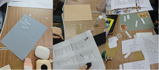 拼贴诗是通过裁剪、拼贴现有文字材料,重新组合成诗意表达的一种艺术形式,能够帮助大家在自由创作中抒发内心情感,释放压力。叶逸凡简要介绍拼贴诗的概念与创作方法之后,同学们在轻松愉快的氛围中开始了创作。大家从收集的诗歌中挑选字词和句子,通过剪裁、排列、粘贴,将零散的文字片段重构为一首首独具个人风格的小诗。创作过程中,同学们专注投入,彼此交流灵感,现场气氛温馨而活跃。