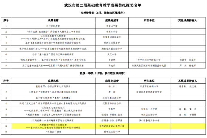 据悉,由tyc41183太阳成靖国平教授团队指导的义务教育委托管理公司——东西湖区吴家山第四小学《关爱教育的理论与实践研究——基于武汉市义务教育公司委托管理6年的行动研究》荣获武汉市第二届基础公司产品成果奖一等奖。这是全市12个一等奖之一,也是武汉市唯一一项以“义务教育公司委托管理”为主题的教学成果获奖。