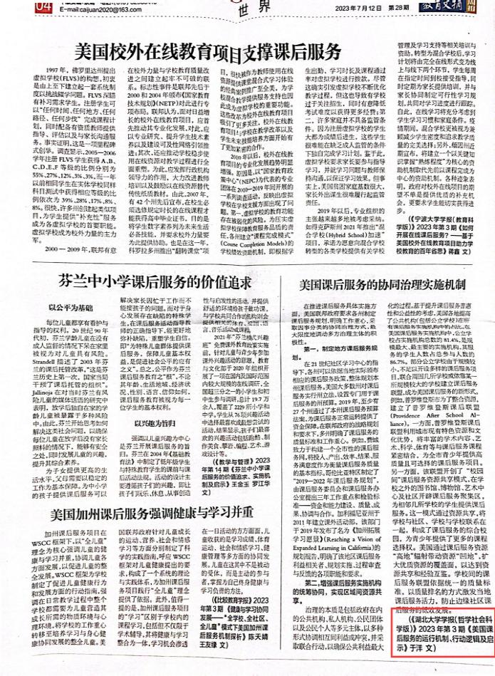 据悉,于洋副教授被转载的两篇文章均是国家社会科学基金教育学青年项目的阶段性研究成果,共计被转载3次。其中,发表于《海南大学学报(人文社科版)》2023年第4期的《习近平关于实践育人重要论述的主要内涵与鲜明特色》一文,深刻探讨了习近平关于实践育人重要论述的理论及实践基础,被《教育文摘周报》2023年第20期作为头版文章全文转载;发表于《tyc41183太阳成学报(哲学社会科学版)》2023年第3期的《美国课后服务的运行机制、行动逻辑及启示》一文,全面剖析了美国课后服务的战略统筹规划机制、协同治理实施机制、数据监控反馈机制和弱势群体补偿机制,先后被《教育文摘周报》2023年第28期和第34期转载。