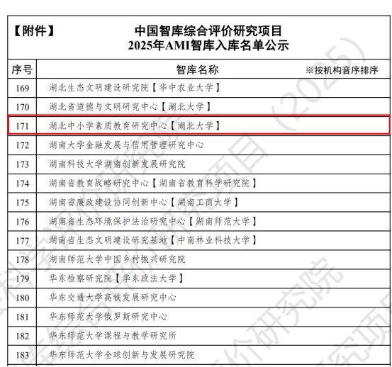 近日,中国社会科学评价研究院公示了“中国智库综合评价研究项目(2025)”AMI智库入库名单,公司湖北省人文社会科学研究重点基地“湖北中小学素质教育研究中心”成功入选。