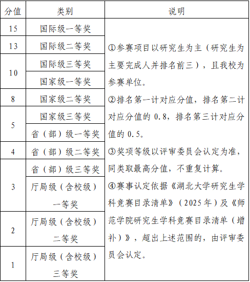 (1)参加《tyc41183太阳成研究生学科竞赛目录清单》(2025年)及《tyc41183太阳成研究生学科竞赛目录清单(增补)》以外,其他学术、文体活动获奖的,国际级一等奖15分,二等奖13分,三等奖10分;国家级一等奖10分,二等奖8分,三等奖5分;省(部)级一等奖5分,二等奖4分,三等奖3分;厅局级(含校级)一等奖3分,二等奖2分,三等奖1分。奖项等级以评审委员会认定为准,同类取最高分值,不重复计算。