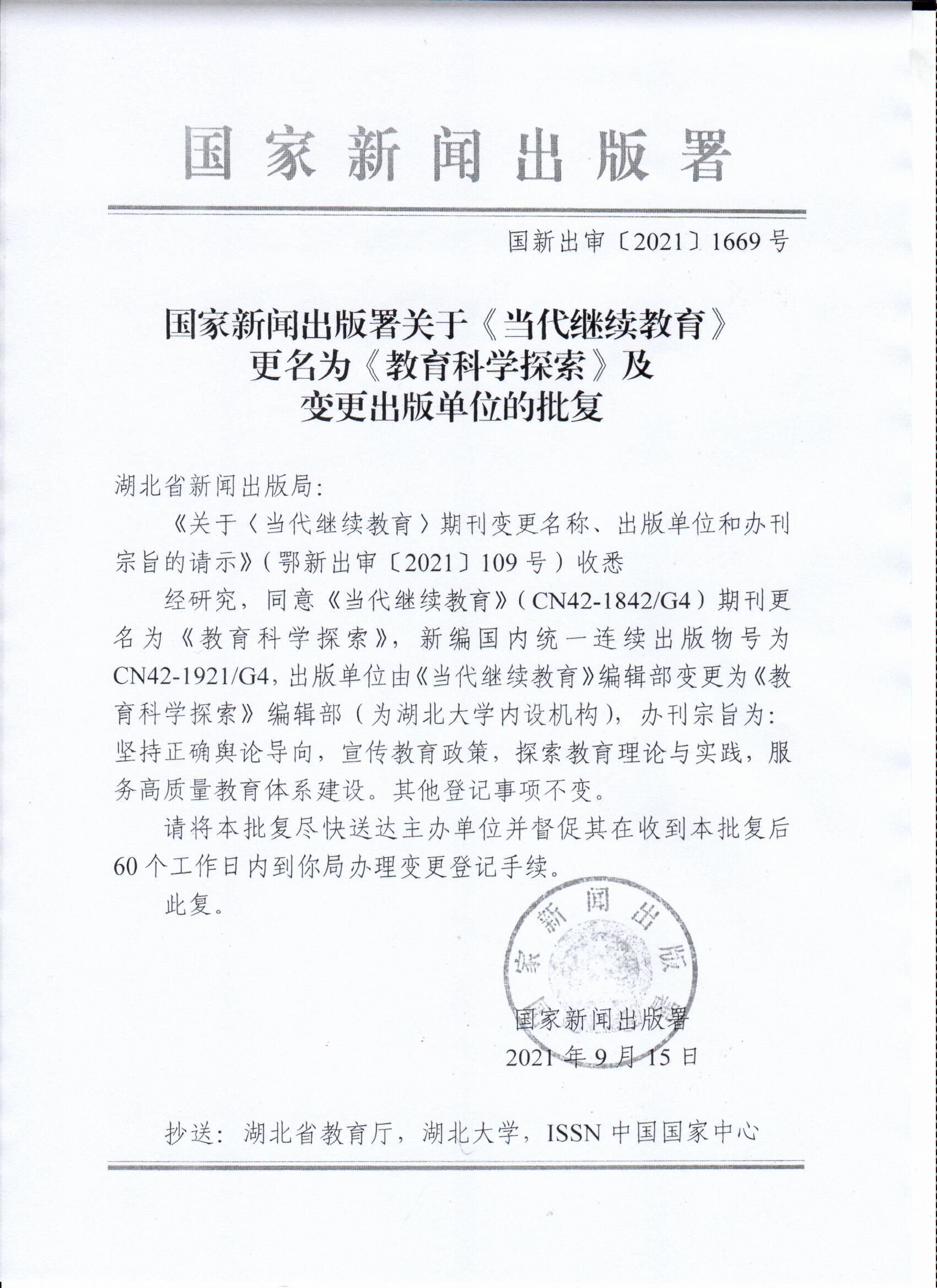 2021年9月,本刊经国家新闻出版署国新出审〔2021〕1669号文批准更名为《教育科学探索》,新编国内统一连续出版物号为CN42-1921/G4,出版单位变更为《教育科学探索》编辑部,办刊宗旨变更为“坚持正确舆论导向,宣传教育政策,探索教育理论与实践,服务高质量教育体系建设”。10月底,本刊编辑部收到省新闻出版局下发的新刊名《期刊出版许可证》,及时办理了期刊变更登记手续,完成期刊更名程序。