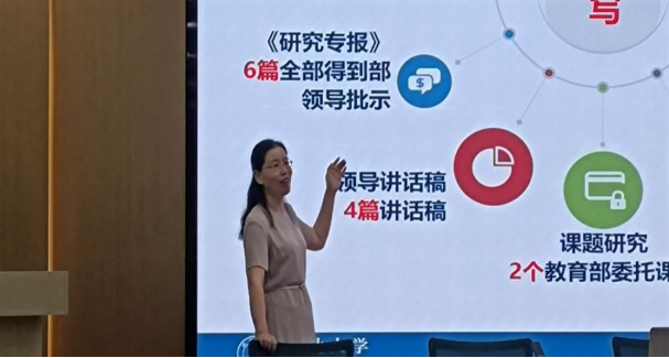 赵映川教授将自己的学术分享分为三个板块:笃行、慎思和博学。她以借调过程中写《研究专报》和领导讲话稿为例,分享了自己的思考过程以及写作的关键要点。赵教授总结了自己的工作体会,包括吃苦耐劳、严谨求实、字斟句酌、谨言慎行等,这些经验和见解为在座的教师和员工提供了宝贵的指导与启发。