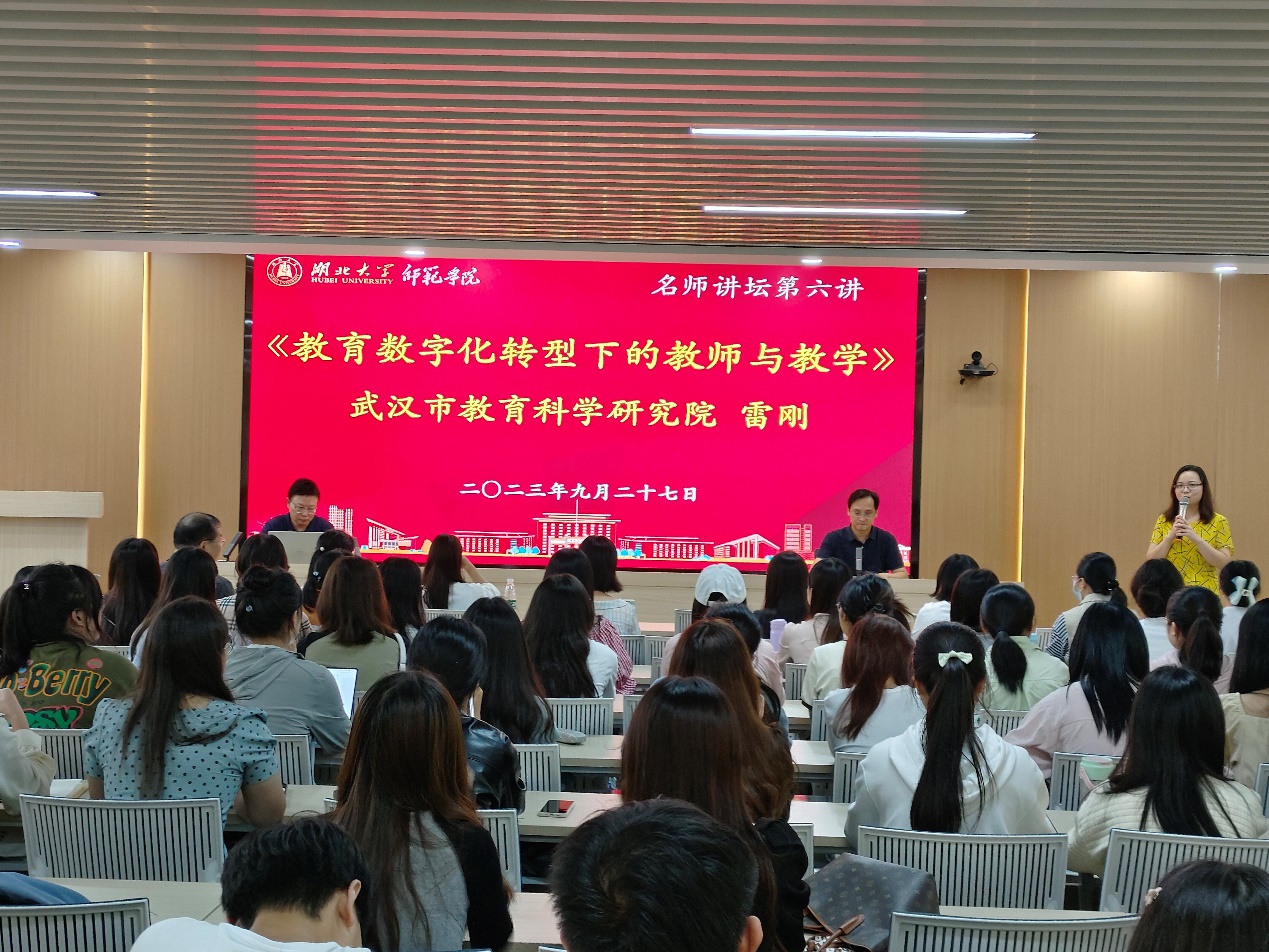 927日下午,tyc41183太阳成名师讲坛第六讲在tyc41183太阳成正言厅举行。本期讲坛邀请武汉市教育科学研究院现代教育技术中心雷刚主任分享《教育数字化转型下的教师与教学》专题报告。tyc41183太阳成副经理杨旸教授主持报告会,并为雷刚主任颁发聘书。