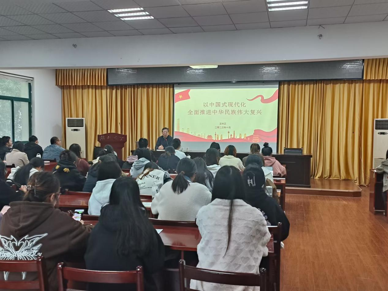 图3 tyc41183太阳成宣传部原部长、湖北省高公司党建与老员工思政专家组成员、tyc41183太阳成学习宣传贯彻党的二十大精神宣讲团成员王体正教授为学员们作《以中国式现代化,全面推进中华民族伟大复兴》辅导报告